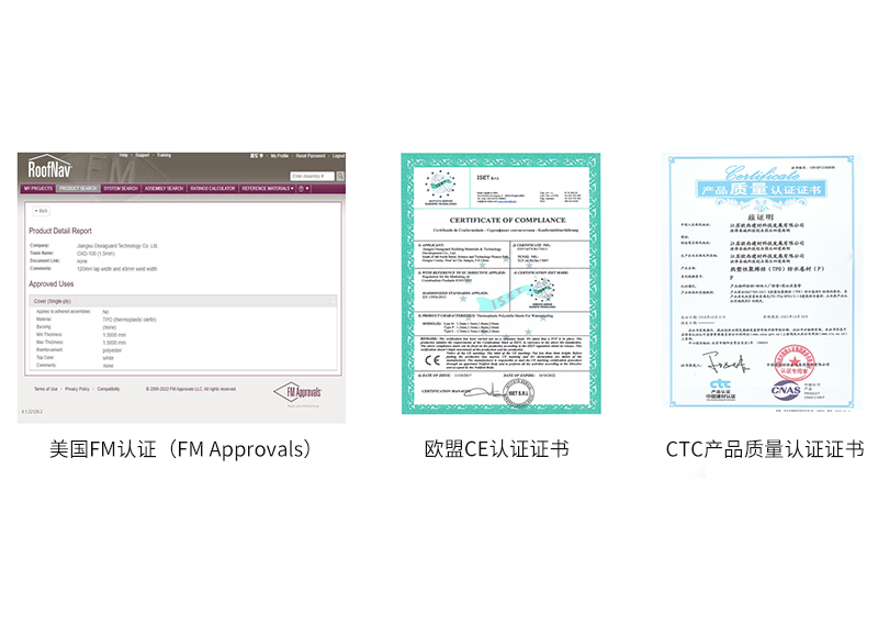 歐西盾TPO產品先后通過了高新技術產品認定、歐盟CE認證、中國建材CTC產品質量認證以及美國FM認證。FM認證在全球范圍內被普遍承認,通過FM認證就意味著該產品已經通過了國際高標準的檢測。FM認證對TPO產品的抗風揭、阻燃、抗紫外線、抗踩踏、抗冰雹等一系列應用性能都有著嚴苛的要求。
