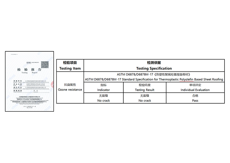 歐西TPO產品具有優異的抗臭氧性能,能夠更長久的抵御臭氧的氧化,保證材料的耐久性能。對于環境中臭氧含量高的地區,無論是材料的環保性能亦或是使用壽命來說歐西TPO產品都是最優選擇,目前公司產品已通過了美標ASTM D6878標準中抗臭氧性的相關檢測。