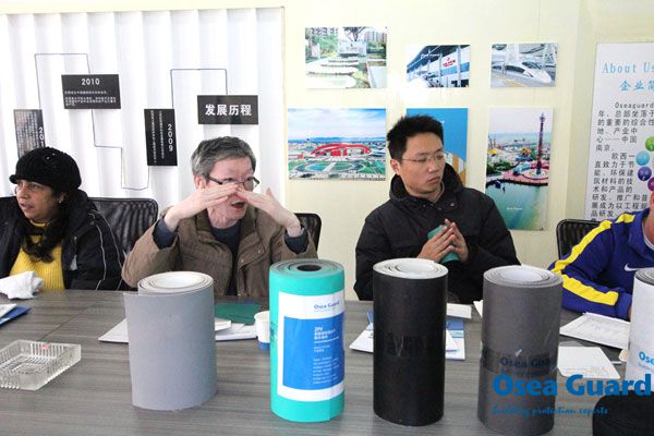 上午八點,吳濤主任一行首先參觀考察了歐西建科現在施工工地——句容北部新城項目,在現場項目經理的帶領下,留學生深入了解了項目現場防水材料施工方法和步驟,實地體驗了施工工具使用。