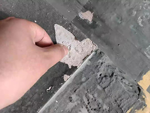 2.防水涂膜在陰角處有開(kāi)裂 原因:涂刷于垂直立面的防水,在未完全干燥時(shí)會(huì)向下流動(dòng),使得防水材料在陰角和管根部位產(chǎn)生堆積,造成該部位防水材料堆積過(guò)厚,而防水表面由于水分揮發(fā)速度較快,迅速干燥結(jié)皮,而內(nèi)部沒(méi)有同時(shí)干燥固化,并在隨后的干燥固化中產(chǎn)生應(yīng)力將已經(jīng)結(jié)皮干燥的表層防水拉裂。 解決方案:對(duì)開(kāi)裂的位置進(jìn)行修補(bǔ);在施工前做倒腳抹弧處理,同時(shí)避免材料在陰角和管根處堆積。如果開(kāi)裂情況非常明顯,倒角就需要做大一些,倒角的圓弧直徑要大于30mm。