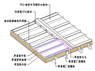 TPO防水卷材在金屬屋面維修工程的應用 針對目前瀝青類卷材以及防水涂料在壓型金屬屋面維修的現狀,東方雨虹研發了金屬屋面維修專用型TPO防水卷材。維修專用型TPO防水卷材采用更加柔軟的材料配方體系,使之能貼合壓型鋼板的波形進行粘結,屋面采用整體維修的方式,從根本上解決金屬屋面滲漏的問題。