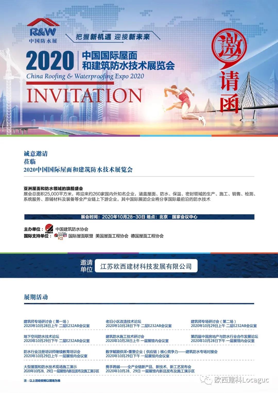歐西建科此次展位號為:B區(qū)406展位,歡迎各界朋友前來參觀交流,也預(yù)祝2020中國防水展圓滿成功,希望本屆展會向社會展示防水行業(yè)疫情防控、復(fù)工復(fù)產(chǎn)及行業(yè)發(fā)展取得的顯著成效,呈現(xiàn)后疫情時期防水行業(yè)勇于面對困難、不斷實現(xiàn)突破的整體風(fēng)貌,助力企業(yè)把握新機遇,迎接新未來!