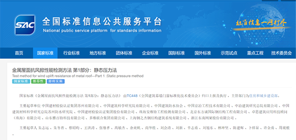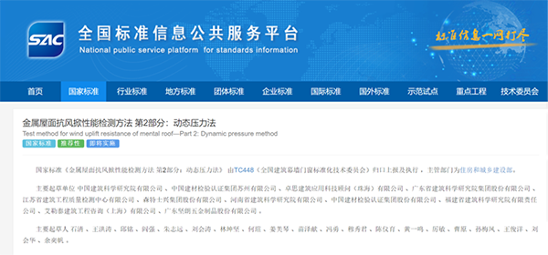 國(guó)家標(biāo)準(zhǔn)《金屬屋面抗風(fēng)掀性能檢測(cè)方法 第1部分:靜態(tài)壓力法》發(fā)布于2021年3月9日,將于2021年10月1日實(shí)施。國(guó)家標(biāo)準(zhǔn)《金屬屋面抗風(fēng)掀性能檢測(cè)方法 第2部分:動(dòng)態(tài)壓力法》發(fā)布于2021年3月9日,將于2022年2月1日實(shí)施。