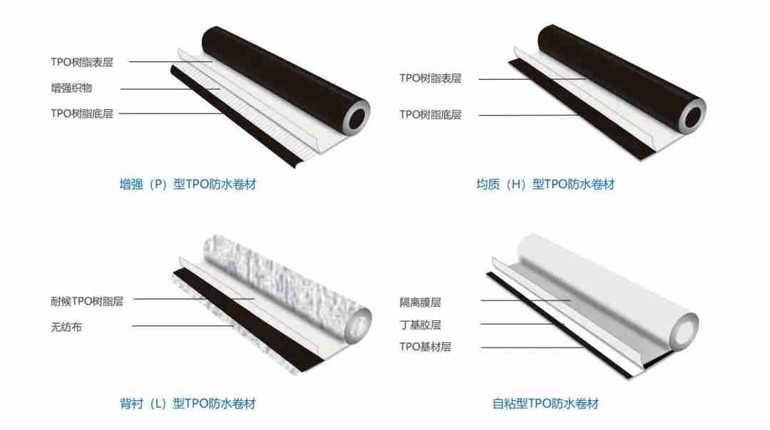 熱塑性聚烯烴(TPO)防水卷材是采用特殊的共混技術(shù)將乙丙橡膠與聚丙烯聚合在一起,添加抗氧劑、光穩(wěn)定劑、高效阻燃劑等助劑,通過(guò)擠出工藝制成的新型防水卷材。卷材不含有毒有害物質(zhì),屬于綠色環(huán)保的防水卷材。